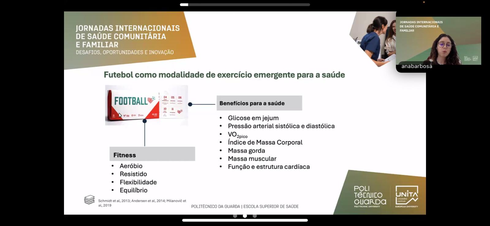 A Professora Ana Barbosa teve também uma participação nestas Jornadas, com a apresentação, online, de uma comunicação oral intitulada Walking Football: mais do que um jogo, uma estratégia de saúde na comunidade.