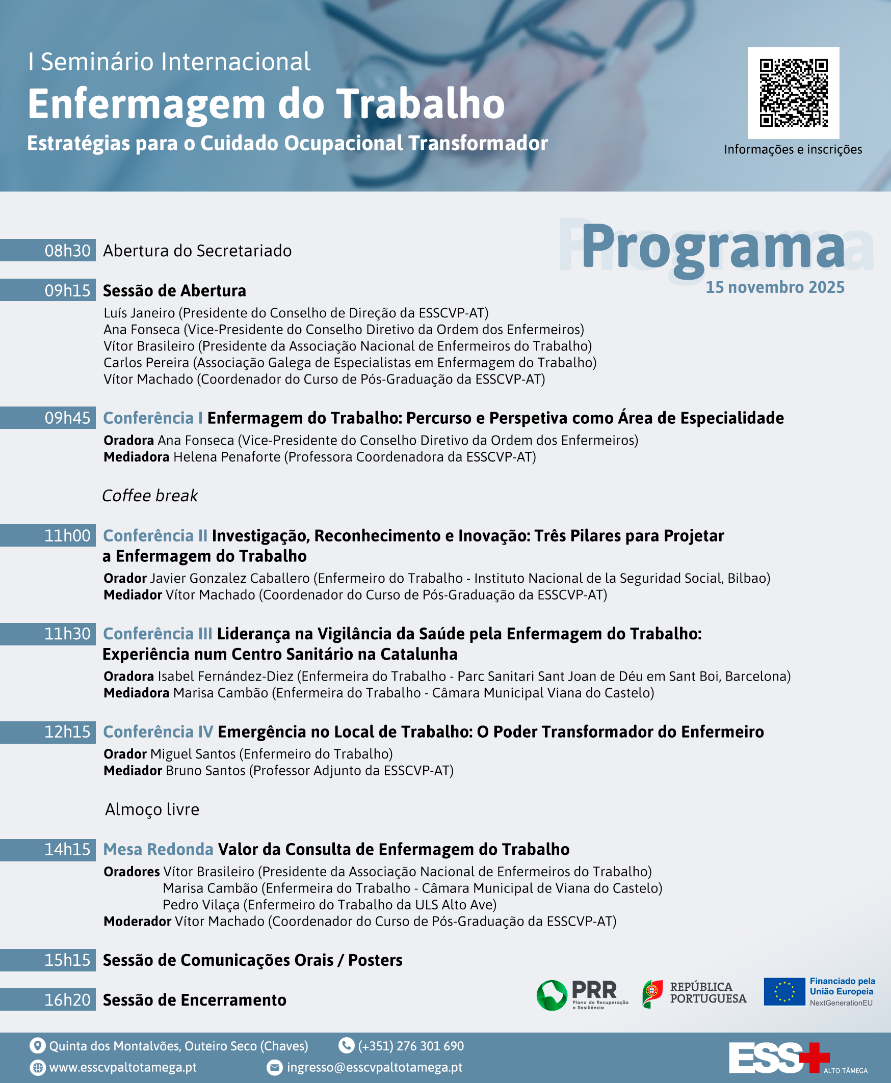 A inscrição deverá ser realizada através do seguinte formulário, sendo obrigatória e tem um custo de 20€. Para os estudantes a frequentar o Curso de Pós-Graduação em Enfermagem do Trabalho 2024/2025, a inscrição apesar de gratuita, é igualmente obrigatória.