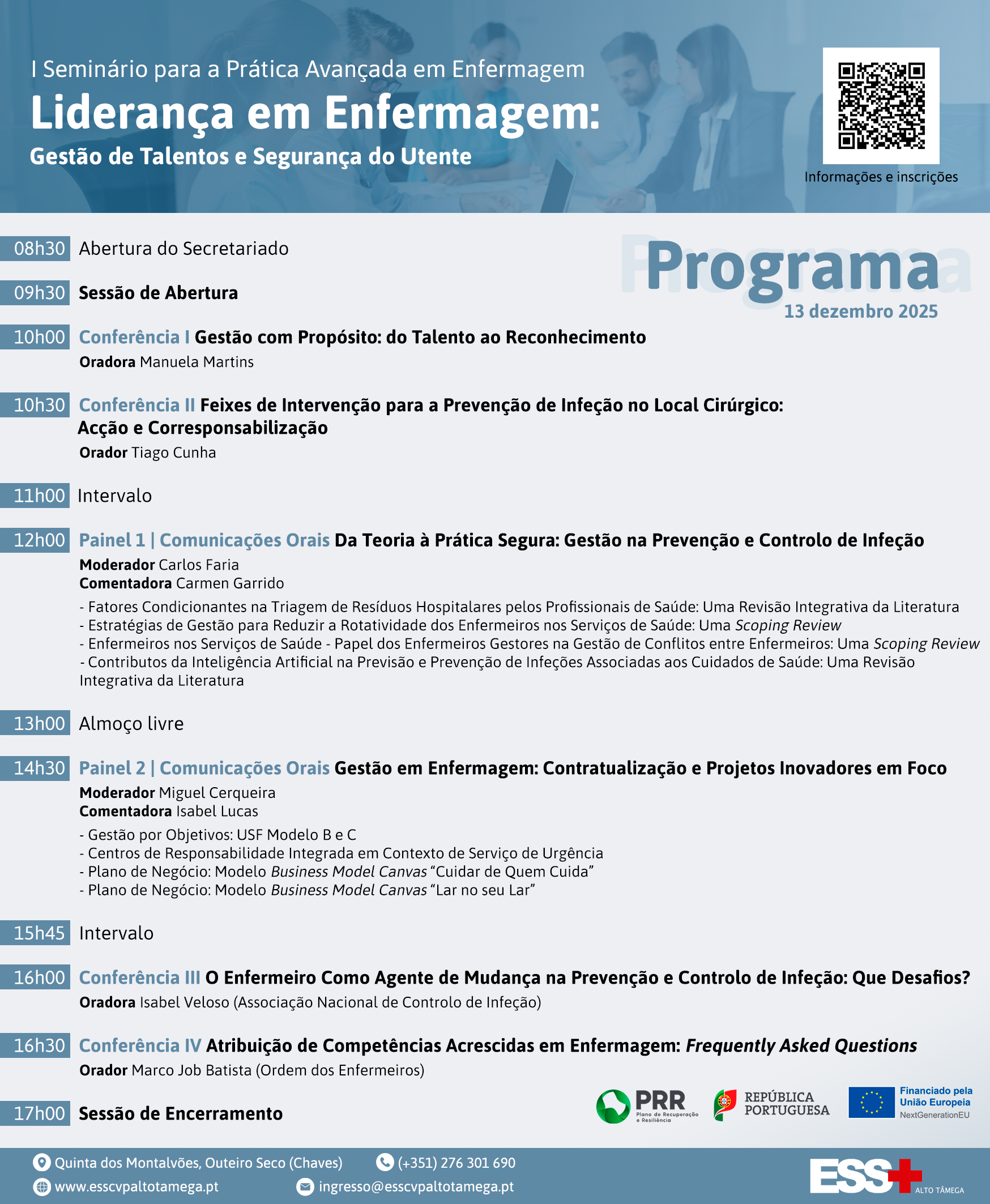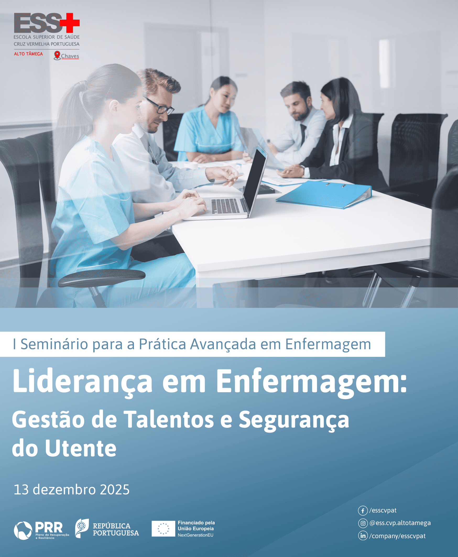 Divulga-se o I Seminário para a Prática Avançada em Enfermagem - Liderança em Enfermagem: Gestão de Talentos e Segurança do Utente, evento que se realizará no âmbito dos Cursos de Pós-Graduação em Gestão de Saúde e Prevenção e Controlo da Infeção 2024/2025, no dia 13 de dezembro de 2025.